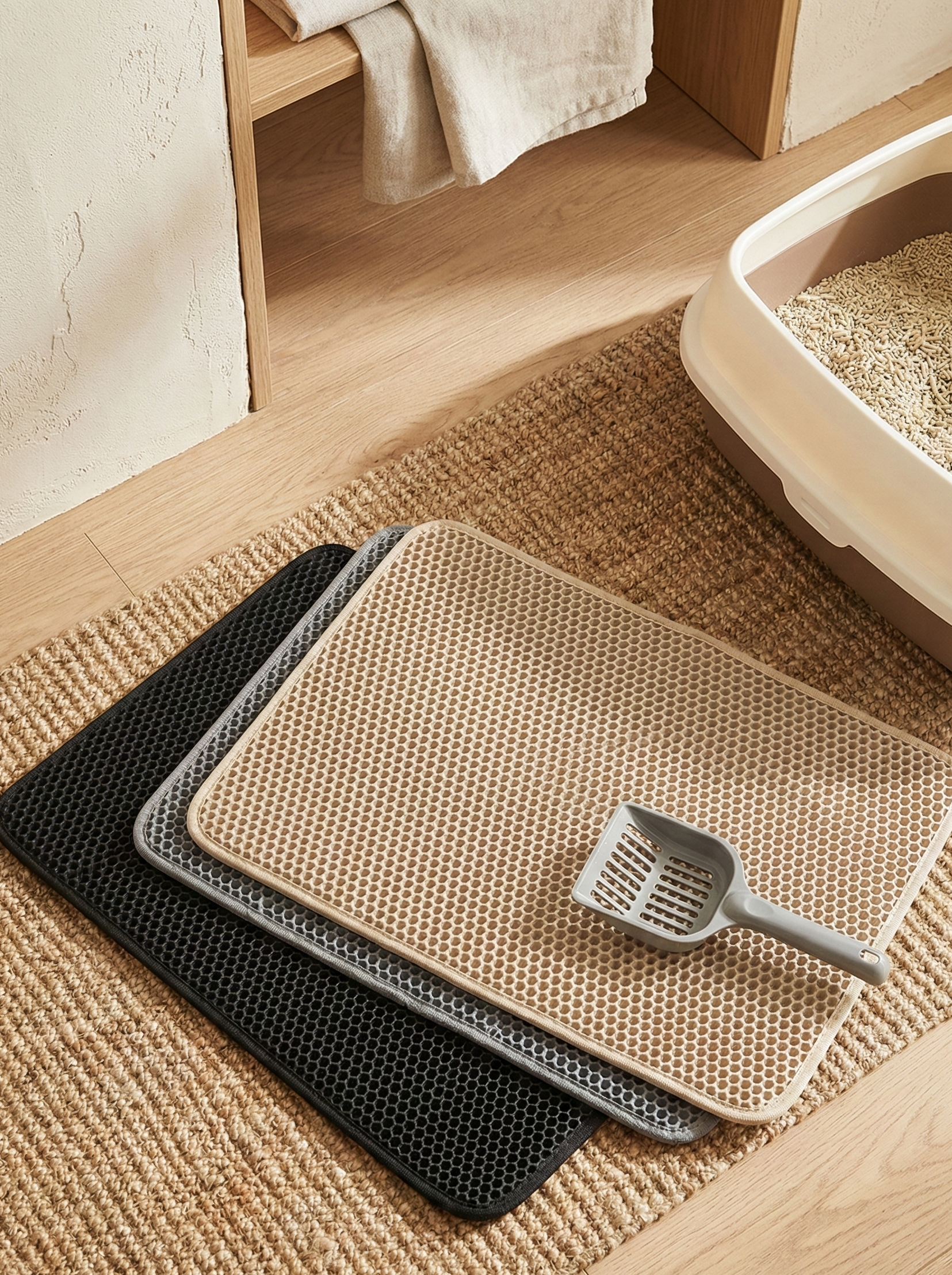 Design-Integration: Die Matte fügt sich durch ihre flache Silhouette und die hochwertige Textur nahtlos in moderne Interieurs ein – für ein diskretes und gepflegtes Erscheinungsbild der Katzentoilette.
